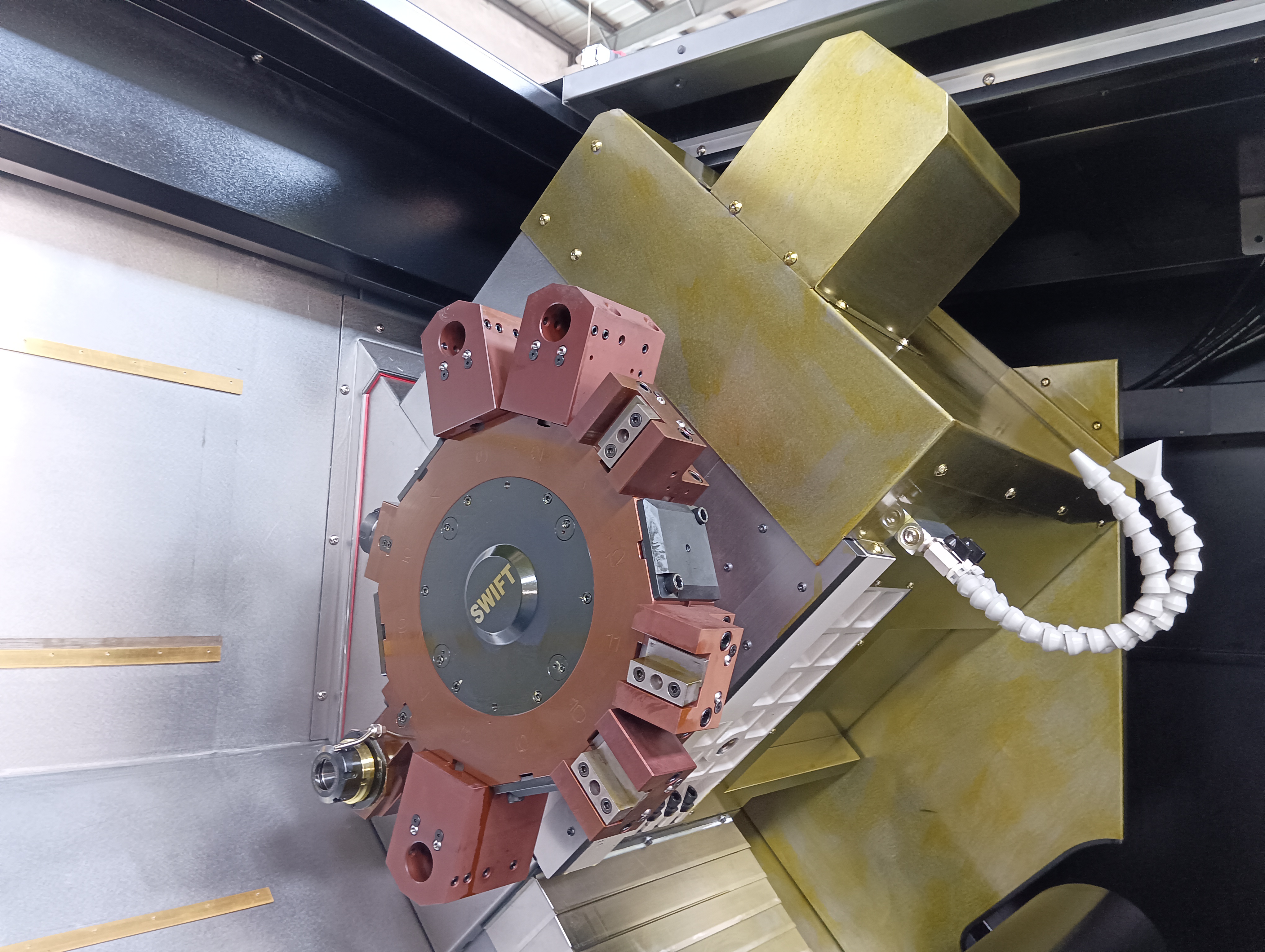 This coordination involves precise timing and positioning to avoid collisions and ensure that the workpiece is correctly aligned for machining.